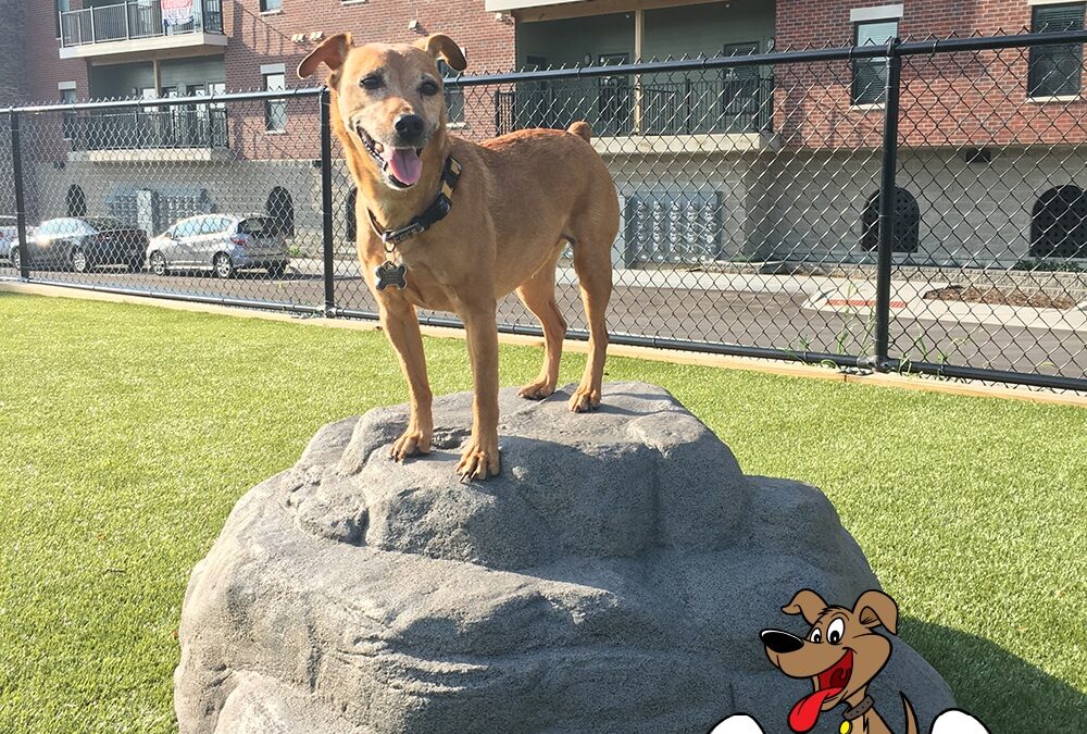 A brown dog stands on the Luxury Climbing Boulder - Large in a grassy, fenced outdoor area near an apartment building. The "Gyms For Dogs" logo appears in the lower right corner.