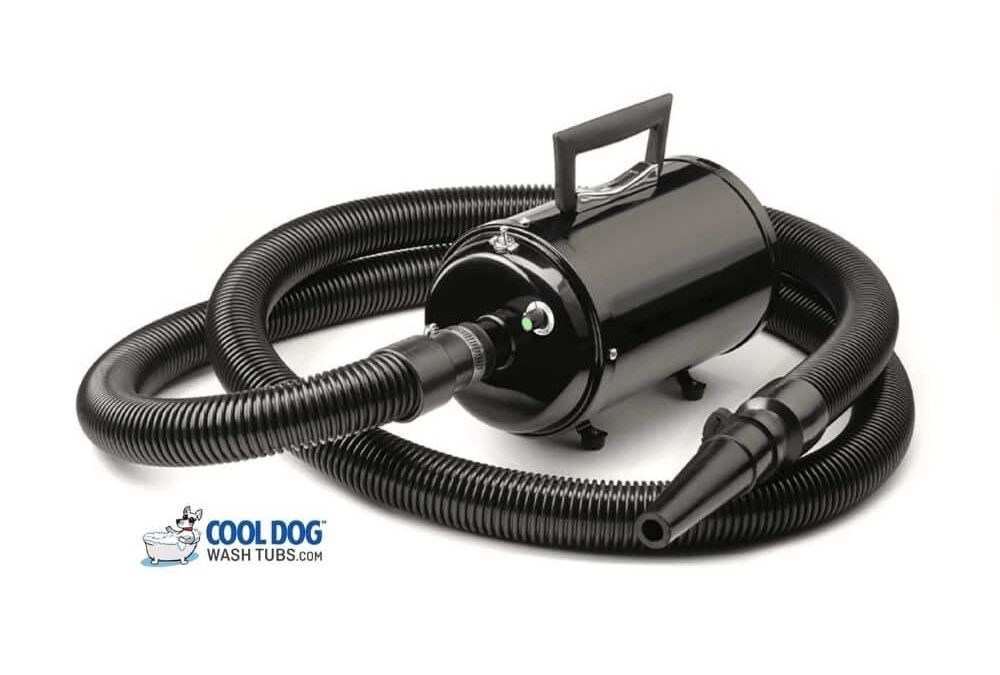 A black, cylindrical Dog Wash Hair Dryer - Wall Mounted with a handle, flexible hose, and nozzle attachments is displayed on a white background. The Cool Dog Wash Tubs logo is visible in the bottom left corner.