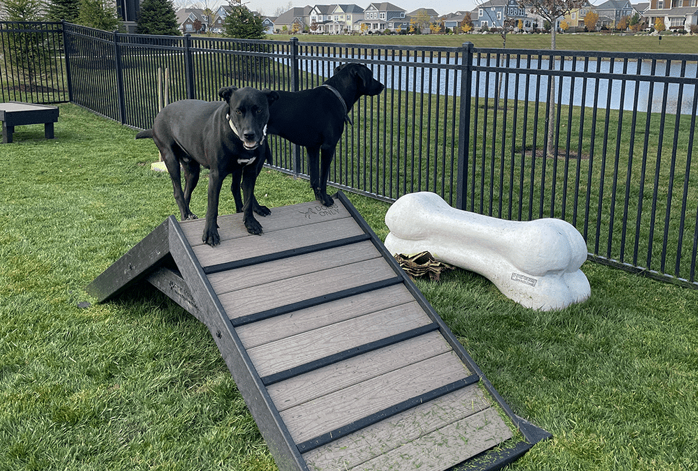 Two black dogs stand on the Hill Climb, a wooden ramp at a dog park with grass, a fence, and a large bone-shaped sculpture. Houses and a pond can be seen in the background.