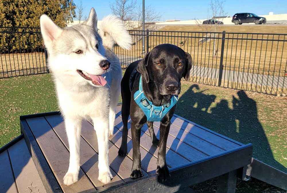 A white husky and a black lab stand side by side on the Bridge Climb 29" Tall (L/X) at the dog park, with “Play & Agility Powered By GYMS FOR DOGS.COM” above them as sunlight casts long shadows.