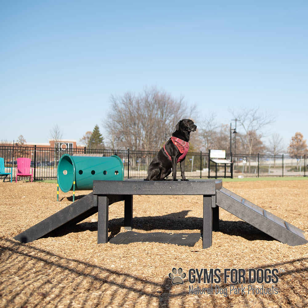 The solid platform on four posts is designed to be multi-functional to accommodate multiple dogs for optimal training. Shade tunnel underneath and training platform on top.