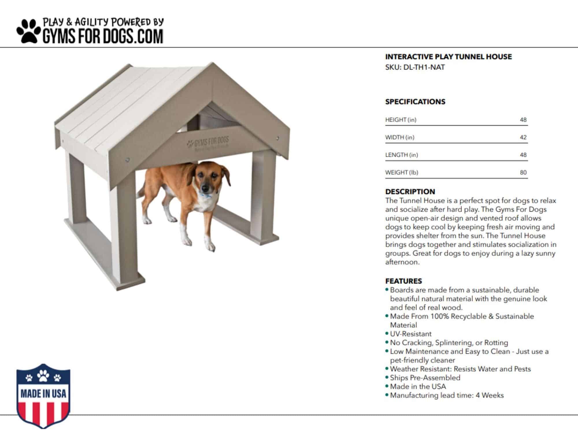 Our Tunnel House is a perfect spot for dogs to relax and socialize after hard play. The Gyms for Dogs unique open-air design and vented roof allows dogs to keep cool by keeping fresh air moving and provides shelter from the sun. The Tunnel House brings dogs together and stimulates socialization in groups. Great for dogs to enjoy during a lazy sunny afternoon. It's a great place for the dogs to hang out, socialize and just be buddies.
