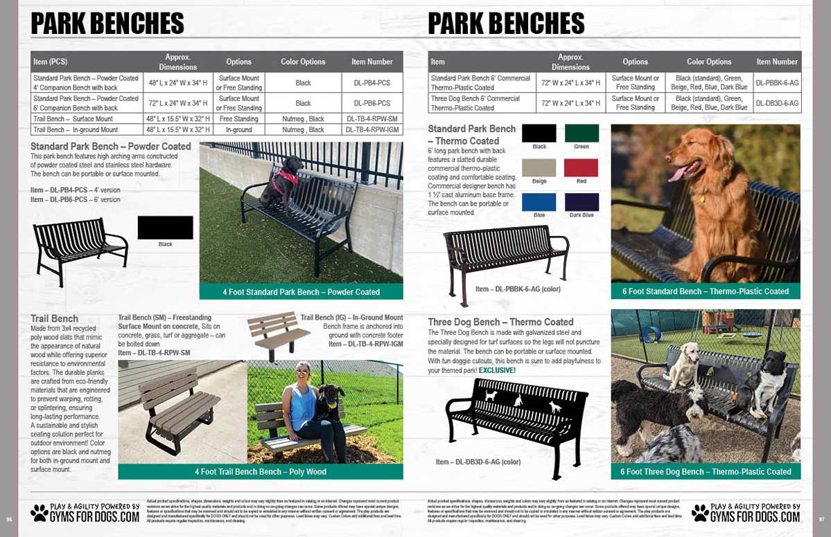 The Three Dog Bench's adaptability is further emphasized by the availability of both surface and portable mounts, providing flexibility in installation options. While the standard color exudes a sleek and timeless appeal, Gyms For Dogs offers the option for custom colors, allowing customers to tailor the bench to harmonize with the specific aesthetics of their dog park or play area.