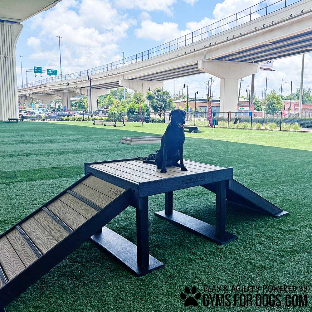 The Bridge Climb Pro 34″ H Training Incline is a carefully crafted structure that combines fun and fitness, providing dogs of all sizes and fitness levels with a stimulating environment that encourages agility, exploration, and socialization. The Pro Training incline features a taller platform perfect for professional dog trainers. The tunnel clearance is approximately 34″ which is great for the really large size or tall dogs. Engineered with the dog’s safety and enjoyment in mind, the Bridge Climb features a sturdy base, two inclines and a spacious platform in the middle. The combination of the inclines and platform offers a variety of play options. Whether your pup prefers climbing, exploring, or simply lounging on the platform, the Bridge Climb caters to all kinds of canine play styles. The area underneath provides a cool, shady area for dog to rest and relax while they survey the other dogs play in the park.