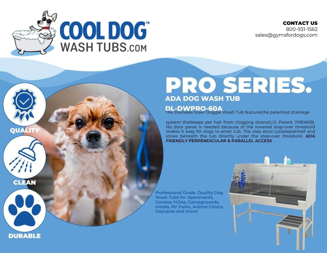 The Cool Dog Pro Series ADA Dog Wash Station is functional, sleek, and incredibly durable. The Stainless-Steel Doggie Wash Tub is ADA friendly and features perpendicular as well as parallel access. With a choice of left of right-hand plumbing and innovative Easy install design, the ADA Dog Wash Station is as accessible as it is elegant.