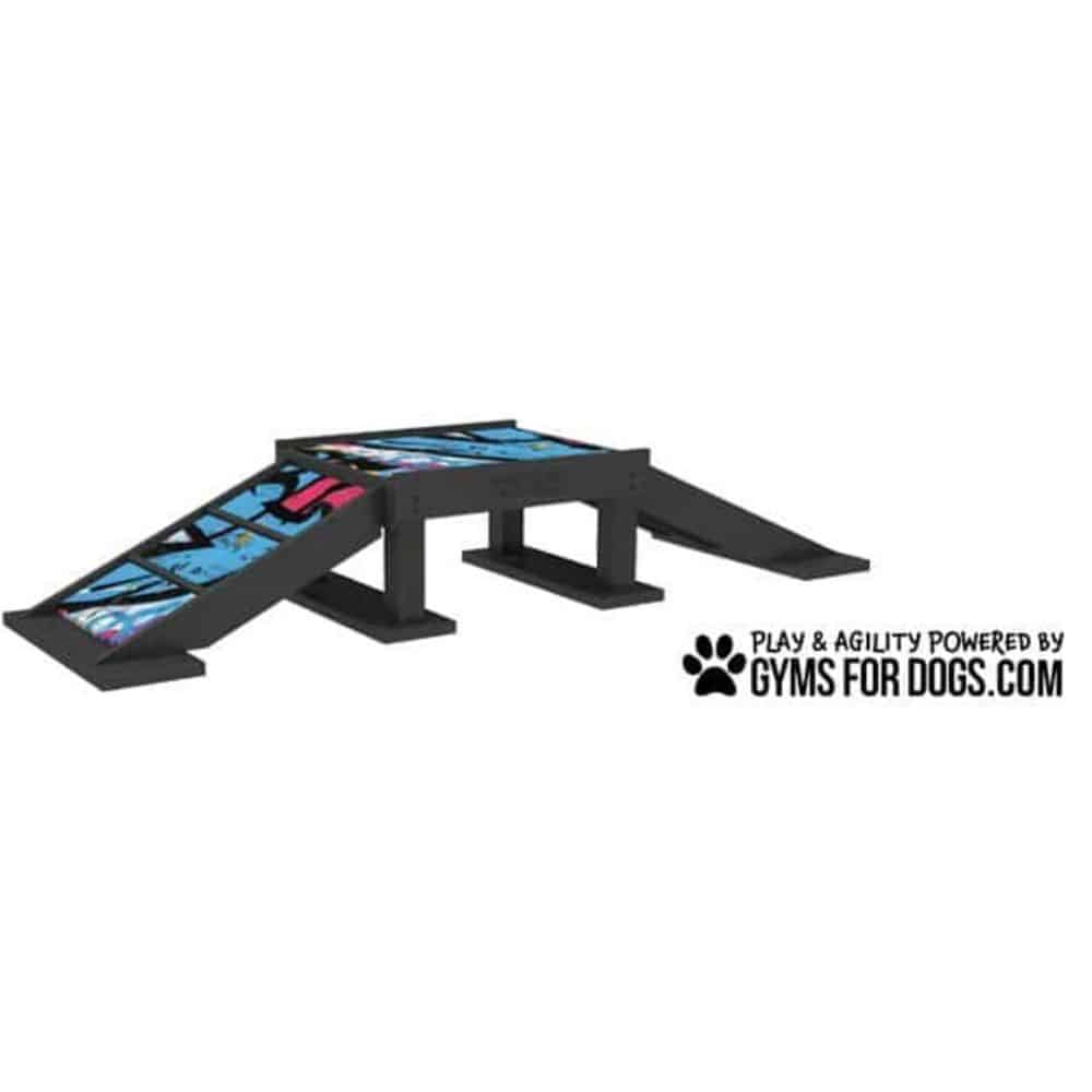 The Graffiti Dog Indoor Play Collection offers a wide range of agility training options to keep your dog active and mentally stimulated. Dogs can run up and down the inclines at their own pace and level of confidence. Incline and decline training helps build muscle in a dog’s legs and torso while developing balance and endurance. The solid platforms on four posts are designed to be multi-functional to accommodate multiple dogs for optimal training. Tunnel underneath and training platform on top. Intended for indoor use.