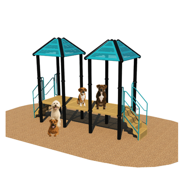 Featuring an elongated triple-platform design with two house-style gabled roofs, this model delivers classic charm and generous space for dogs to interact, climb, and cool off. With ample room to roam and relax, Café 36 brings a classic playground vibe to any dog park, facility, or enrichment area.