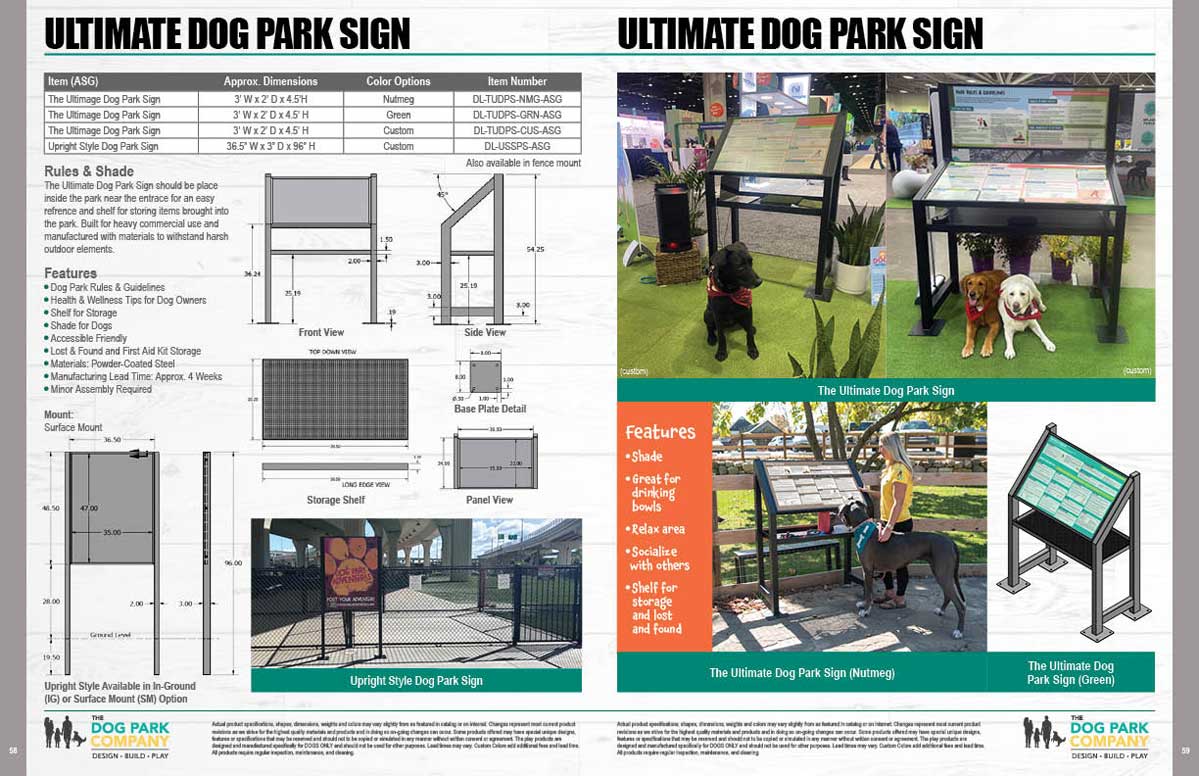 The Ultimate Dog Park Sign collection is unlike any other. This collection provides park rules and wellness tips for dog owners. We recommend placing this sign away from the entrance (so it doesn’t get crowded) but in a prime location. Not only does it provide park rules and important wellness tips for dog owners, It’s also a great catch-all for leashes, phones, toys and even provides shade for dogs!